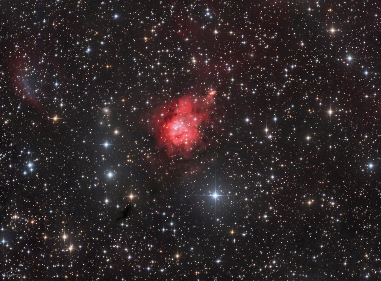 Sh2-305 is one of the many intriguing emission nebulae found in the Milky Way. Located in the southern constellation of Puppis, this H II region is a vast cloud of ionized gas, where the energy from newly formed, hot stars excites the surrounding hydrogen making it glow in its characteristic reddish hue. The nebula is also known under alternative designations such as RCW 11 and LBN 1084.