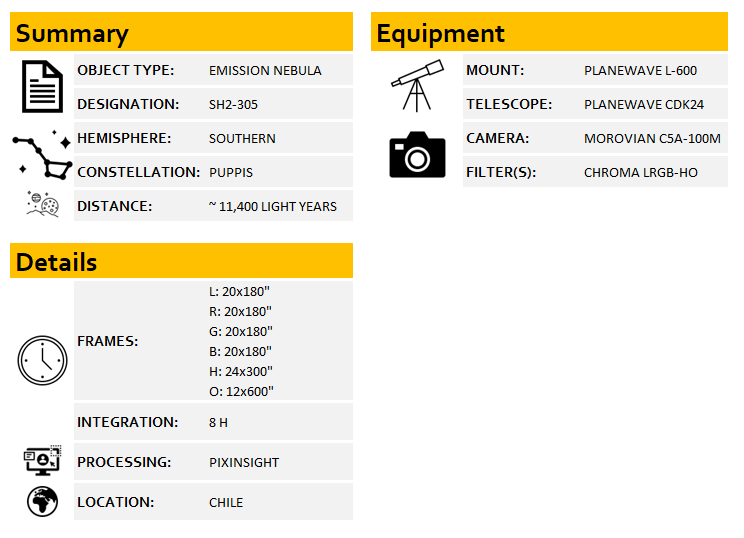 Offering a helpful photometric reference in this image, just southeast of Sh2-305, lies HD 59674, a relatively F-type main-sequence star (spectral type F5) with an apparent magnitude of 7.9. Located just 370 light-years from Earth—vastly closer than the nebula—it is unrelated to Sh2-305 but appears superimposed due to our line of sight.