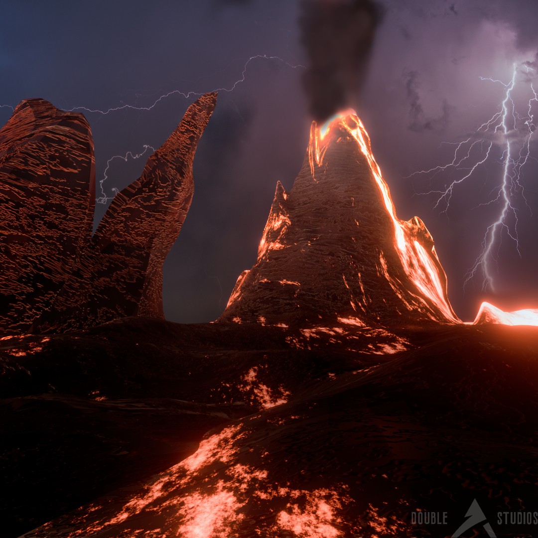 Towering volcanic spires dominate the landscape, erupting with molten lava that flows like rivers of fire. The sky is alive with violent storms, lightning bolts crackling through dark clouds, illuminating the alien terrain below.