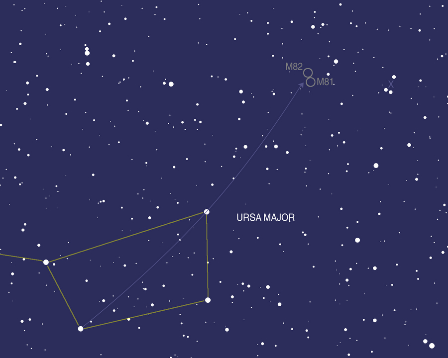The optimal time to observe M81 and M82 is during the spring months, particularly in March and April, when Ursa Major is prominently positioned in the evening sky. During this period, the galaxies reach their highest point above the horizon, providing the best viewing conditions. Under dark skies, away from light pollution, both galaxies can be spotted with binoculars, appearing as faint smudges. A telescope with an aperture of 8 inches (ca. 20 cm) or larger will reveal more structural details, such as the spiral arms of M81 and the elongated shape of M82.